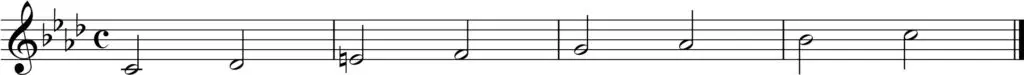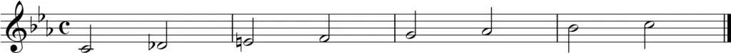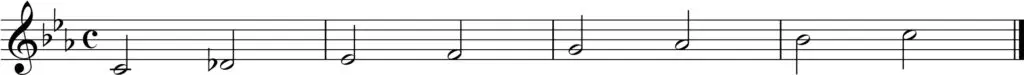 Den frygiske skalaen er en mollpreget modal skala. Som mollskalaer flest, har den lavt 3.og 6.trinn, og i likhet med ren moll, har den lavt 7.trinn. Frygisk skala skiller seg fra ren moll gjennom et senket andre trinn. Her ser du en C-frygisk skala notert med C-molls fortegn, men med et løst fortegn som senker 2.trinn en halv tone: