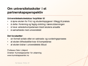 - Universitetsskolene skal bidra til å heve kvaliteten på lærerutdanningen og dermed også på grunnskolens undervisning.